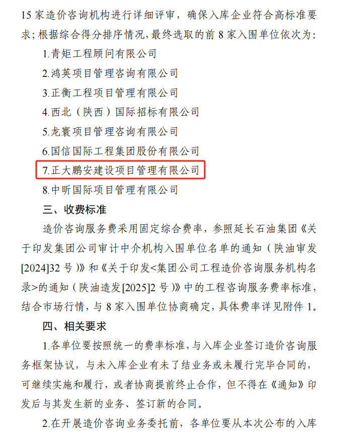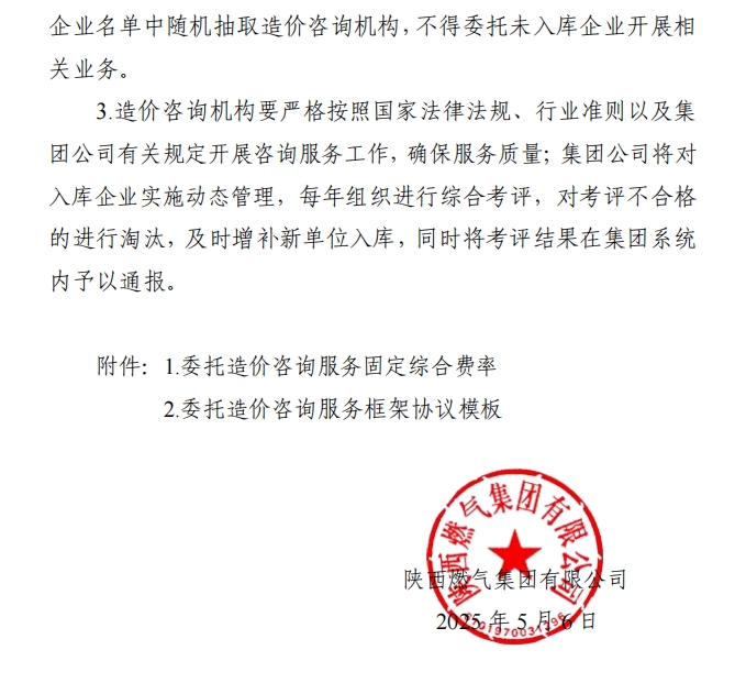 2025年4月11日,經(jīng)評標(biāo)委員會綜合評審,招標(biāo)人確認(rèn),正大鵬安建設(shè)項目管理有限公司入圍陜西燃?xì)饧瘓F有限公司造價咨詢庫入庫企業(yè)選聘項目。
