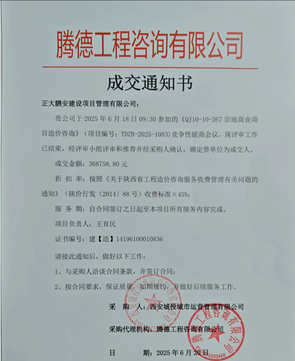 2025年6月19日,經(jīng)評標(biāo)委員會綜合評審,招標(biāo)人確認(rèn),正大鵬安建設(shè)項目管理有限公司中標(biāo)陜西省西安市QJ10-10-267宗地商業(yè)項目造價咨詢。